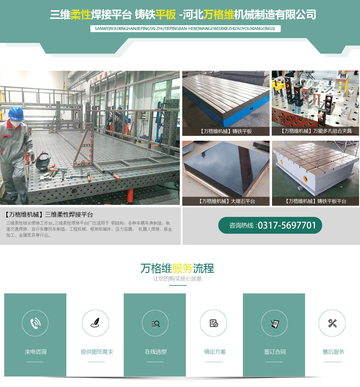 河北萬格維機(jī)械制造有限公司位于著有中國(guó)鑄造名城、中國(guó)鴨梨之鄉(xiāng)的泊頭市,東臨渤海北依京津,處于鐵路、公路、海運(yùn)的樞紐地帶,交通方便,地理位置_。河北萬格維機(jī)械制造有限公司主要產(chǎn)品有: 三維柔性焊接平臺(tái)、鑄鐵平板、多孔組合夾具、檢驗(yàn)平臺(tái)、基礎(chǔ)平臺(tái)、T型槽平板、研磨平臺(tái)、劃線平板、鉗工工作臺(tái)、大理石平臺(tái)、方箱方筒及塞規(guī)系列。